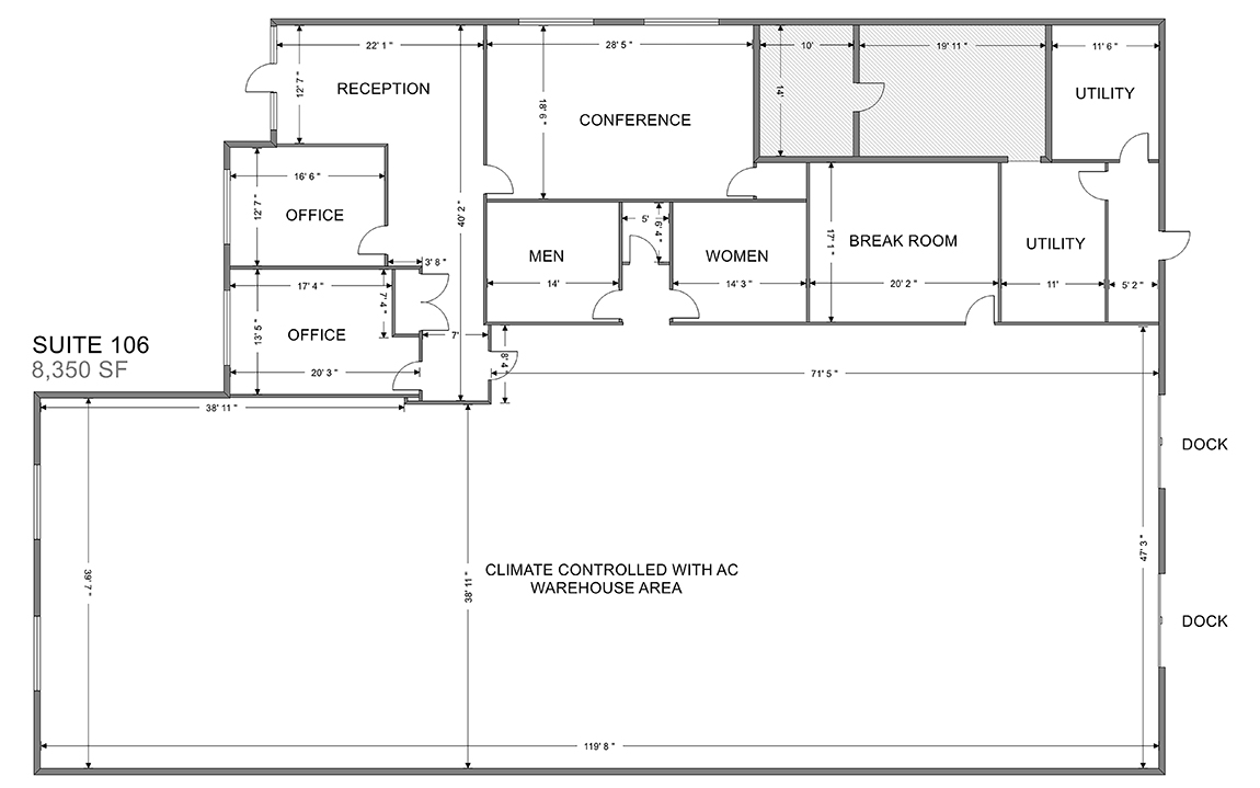 | Dock Doors | Suite 106: two dock doors (8'x8') |